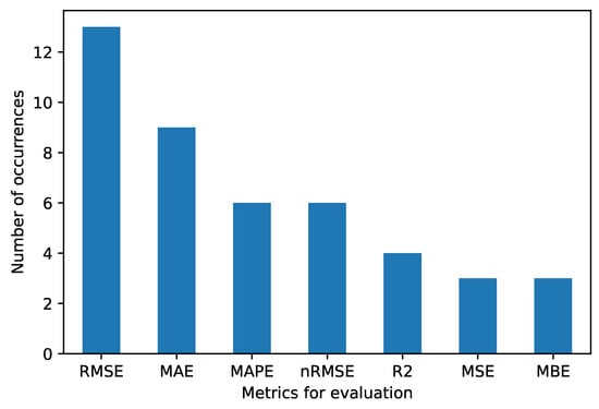 Figure 3 shows the performance metrics that appeared in more than one mapped paper, while Table 3 presents their abbreviation and mathematical expression. The root-mean-squared error (RMSE) is the most common metric observed, with 13 occurrences. It is also interesting to note that the mean squared error (MSE), RMSE, and normalized RMSE (nRMSE) are directly related since they are based on the squared difference between forecasts and measured values [62]. In this case, 22 papers (44%) applied at least one of these metrics. Some papers did not mention any metric to evaluate their predictions.