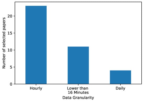 Figure 4 presents the number of papers by granularity. This figure shows that there are three commonly applied granularities: hourly, lower than 16 min, or daily. The first is the most common in the mapped papers, with 23 occurrences. Concerning the “lower than 16 min” granularity, we observed distinct quantities: 15 min, totaling five cases; 10 min, totaling three cases; and one minute, totaling three cases. The daily case was in four scenarios.