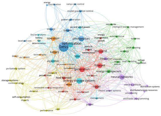 Finally, the network representation of the most mentioned terms in the selected papers is presented in Figure 5. In this network, the node size is proportional to the number of connections it presents, and the colors are a result of a clustering process. There are at least seven different groups. It is important to highlight that the terms BESS, photovoltaic, generation, energy storage system, forecast, microgrid, neural networks, and operation present the largest nodes.