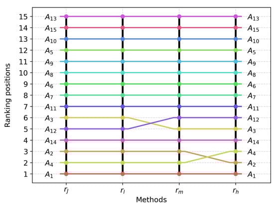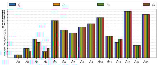 Not all of the aforementioned rankings are consistent with each other. Most of the alternatives (–, –) are ranked the same in each case. This is particularly important regarding alternative , which holds the most significant first position in the ranking. However, there are differences for the remaining alternatives. Figure 1 provides a visual summary of all the rankings in question in the form of a bar chart.