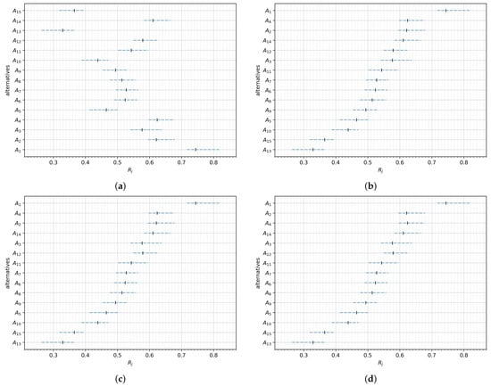 Relative closeness values for alternatives. (a) Not sorted. (b) Sorted by the lower limit of . (c) Sorted by the mean of the lower and upper limit of . (d) Sorted by the upper limit of .