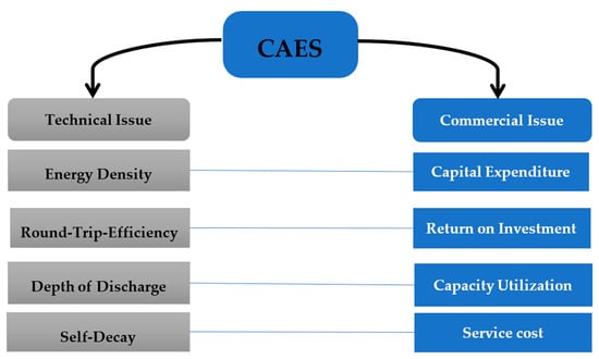 The performance indicators considered are those that ease cost characterization and technical attributes. This will enable each parameter to be used for a comparison of different types of energy storage. Of interest to this review are specific application domains, namely, behind-the-meter systems, grid-connected energy storage, and standalone systems. As indicated in Figure 1, the technical metrics of a BESS have commercial implications or equivalent economic metric terms that can be used as indicators on both sides of technical and economic considerations as a guide during the decision-making process with respect to asset acquisition. Requirements must often pass commercial and technical assessments to ensure the viability of CAES as a BESS of choice, regardless of the application domain.