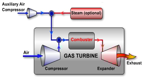 As demonstrated in Figure 3, the auxiliary injection of compressed air into the combustors not only increases the power output but also helps the main compressor pull more compressed air into the gas turbine. In [23], an injection of dry air was used to increase the spinning reserve by 16% and to ensure that temperature- or elevation-induced variations in output power were prevented. Several air-injection (AI) patents were filed, as seen in [24,25,26]. Different air/fuel ratios were tested to unlock the optimum stoichiometric values that best improved the yield of power from the same amount of fuel in [27,28]. Improved heat rates and lower emissions are noticeable in most of these types of compressed-air-assisted systems. For the injection of humidified air, an improvement of 15–25% in the output of power is noticeable, while the injection of dry air yields an increase of about 9–12%.