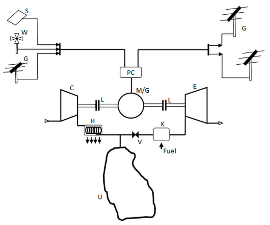 A basic example of a CAES system is shown in Figure 4 below. The electrical energy to charge the system can come from a variety of sources based on availability, such as wind (W), solar (S), or even a utility supply grid (G).