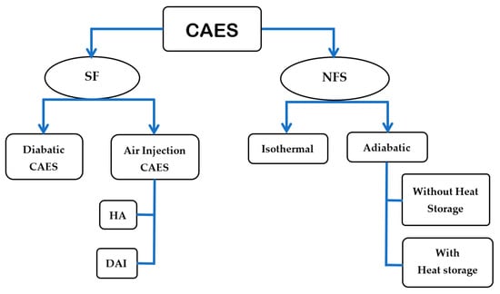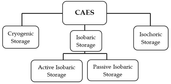 Types of compressed-air energy storage (CAES) technologies with variants.