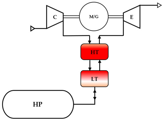 Instead of allowing compression temperatures to rise unabated, intercoolers or other means of heat extraction and storage can be used. Other attempts at combined heat and power systems were explored in [36] with the aim of using the compression heat for other purposes. But in an AA-CAES system, the compression heat is stored in a thermally insulated unit, and the compressed air is stored in a separate storage chamber. Compression heat can be captured through heat-absolving and heat-releasing structures, as in [37,38,39]. In [40], the proposed Adele CAES project has two storage units for the storage of heat and compressed air, but on a larger scale. Figure 6 shows another approach that further improved system efficiency in [41], using the thermal capture of the entire temperature range through the use of separate high temperature (HT) and low temperature (LT) grades of heat stores instead of the single units used in previous thermomechanical CAES systems. The compressed air vessel (HP) in Figure 6 can be of a lower pressure compared to regular high-pressure CAES systems via taking advantage of energy-dense thermal stores. For power regeneration, the compressed air is reheated through multilevel thermal stores before it expands to generate power. The complexity and improved parameters associated with separate storage units have attracted a significant amount of interest. The simulations and studies carried out by [42], which involved all thermal and mechanical losses, estimated that a good round-trip efficiency of 70% is possible. However, the realization of systems of this nature remains a significant problem due to design issues in developing machines that operate at such extreme temperatures of 600 °C or more. Other means of thermal storage have been explored; in [43], phase change materials were used, and in [44], a packed bed or rocks were used. With improvements in material technology, metal alloys capable of stability under heavy thermal and mechanical cycling can be developed to meet this requirement.