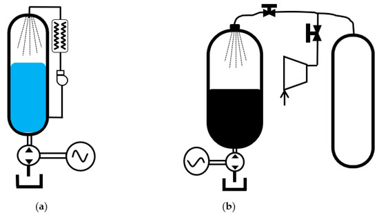 Despite this, variations in logarithmic pressure worsen efficiency and deflate its simplicity and cost advantage. Also, as a closed-cycle system, accumulator-based CAES has poor energy density. To improve efficiency, via a simulation analysis, the authors of [73] estimated of an RTE of 66% which was obtained using isothermal charging that combined mist spray and a slow charging rate to reduce the increase in temperature. Figure 8a demonstrates that the mist-spray method is such that the spray fluid can be cooled during compression and heated during expansion, which improves heat transfer. Despite the fact that the initial and final charge pressures have a pressure ratio of 2, which increases the RTE by 5%, the energy density is poor, and variations in output power with the vessel’s energy content remain a problem. Such a system cannot work with a constant load profile over its entire discharge period. If an accumulator with a higher peak pressure capacity is used, the contribution to the increase in energy density seems to be less significant due to the wide pressure variation. The system demonstrated in [71] had an energy density of 0.39 kWh/m3, even though the peak pressure was 70 bar. But in a real-life scenario, for such a battery to meet the desired energy need, a huge system would be required. The energy density problems of accumulator-based CAES are due to its closed system configuration, which is lower than the air-breathing open-system type, as indicated in Equation (4). As an energy carrier, the fluid takes up a sizable amount of space inside the accumulator; unlike gas, which holds energy, it does not play an active role in the energy storage itself. Also, dead volume is always necessary in the pneumatic and hydraulic domains of the accumulator, as demonstrated in Figure 8a, to prevent cavitation. Cavitation has a damaging effect on hydraulic devices, causing surface wear, increased noise levels, the formation of heat spots, and energy losses. These problems were studied and verified in [74,75]. The use of dead volume is encouraged to avoid moisture in the pneumatic domain while also preventing aeration problems in hydraulic systems. Hence, in many hydropneumatic devices, direct contact between liquid and gas is prevented through the use of interface isolation like a bladder, piston, or even diaphragm [76].