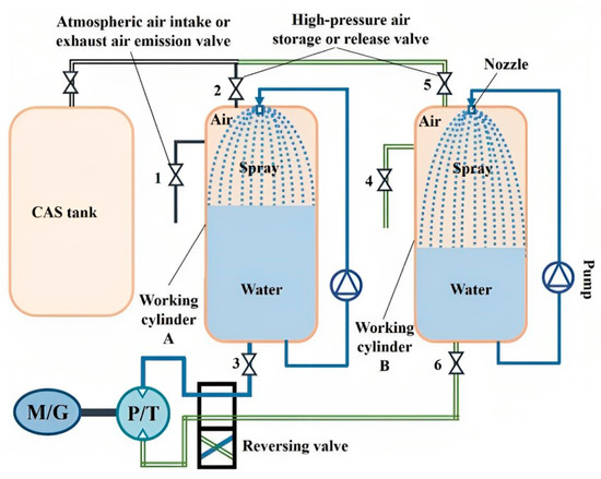 The combined role of accumulators as energy converters and storage is plagued by poor efficiency and energy density problems. Rapid declines in pressure also impose a load profile that must follow declines in storage pressure or the system risks overload and shutdown. This necessitates a system subunit that works effectively as a converter or as storage only. A purpose-developed energy-converting machine should have better performance attributes for specific needs. A liquid piston using an air–fluid interface fits into the already established advantages of hydropneumatics, as previously explained. In [79], an experimental CAES system that uses two alternating LPs, as shown in Figure 10, was developed.
