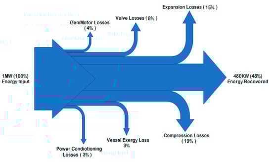 Regardless of the configurations developed, they are such that fuel is still a significant part of the entire plant, and compressed air only plays assistive roles. In the transition to using compressed air as the main energy system, the first sets of commercial-scale compressed-air energy storage systems are the 270 MW Huntorf system in Germany [29], and Macintosh’s 110 MW CAES plant in Alabama, United States [30]. More of these types of carbonized CAES have been developed are under development or have been proposed in recent times.
