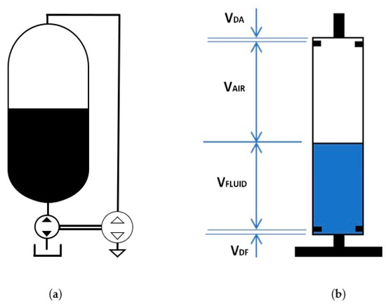 A closed gas cycle CAES is a fixed-air-mass battery energy system that traps air within an enclosed chamber. Its topology is such that the storage chamber and the energy converter are not linked to any air-breathing port. A fixed volume of air is compressed and expanded continuously during charging and discharging, respectively, without the intake of new air. A common example of a closed gas cycle is the accumulator-type converter used in [21], shown in Figure 2a, in which the fluid tank, accumulator chamber, and hydraulic pump/motor are the main components used. How the energy converter and storage unit are connected determines the quantities of stored air mass and fluid content that can be reused in each operation cycle and regenerate compressed air back into electricity. In Figure 2a, the usable air mass does not occupy the entire storage volume. The air volume is considerably lower when fully charged, at which point the fluid volume is at a maximum. This can be expressed as