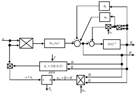 In [21] is embedded into the pump’s model as a neural network estimator with and as inputs. Further, is used to compute the load torque developed by the pump. This introduces inaccuracy into modelling because the motor loss is not eliminated from the computation. In the proposed modelling, , , and experimental data were used to compute the value for neural networks training. However, the neural network efficiency estimator is based on three inputs: (the frequency of the voltage supplied to the motor), and . Adding into the estimation algorithm enhances the accuracy since it is extracted directly from the control algorithm, whereas and are simulated values with a ±5% acceptable error.