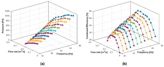 Steady-state testing is used for creating the training database to design the neural network estimator of the combined efficiency. The frequency of the stator voltages is kept constant at intervals of 2 Hz between 30 Hz and 50 Hz. For each constant frequency, the gate’s position varies between 0 and 11 cm of the duct width with a step of 1 cm. The gate’s positions of 0 and 11 cm mean the entirely open and entirely closed duct, respectively. For each operating point, the following data are collected: (reference value), and (measured values), and (computed value based on , , and ). In total, 132 operating points were recorded, as shown in Figure 3, including and the stator current amplitude. Note that this figure depicts eleven − and − characteristics of the fan for specific frequencies.