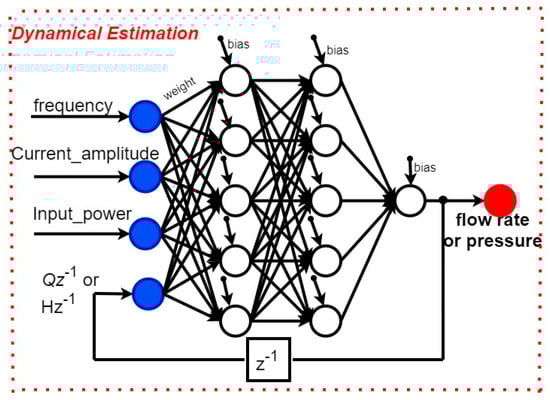The introduced dynamical ANN estimators have the same inputs as the quasi-steady ones, and they have one additional input with the flow rate/pressure estimated at the previous ANN sample time to account for the first-order dynamics of the fan itself (ANN possessing its own dynamics). Except for this additional input, their architecture is identical to the second type of the quasi-steady estimators and is depicted in Figure 5, where z−1 denotes one sample time delay of the ANN. They are trained based on the same dynamic experimental data.
