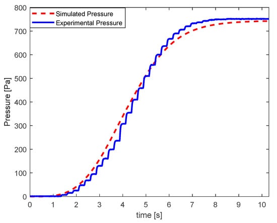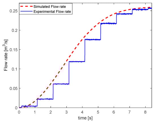 Initially, the start of the centrifugal fan from zero state is explored. The reference of the frequency of the stator voltages is increased linearly as a function of time till the rated value of 50 Hz is reached. Figure 6 and Figure 7 show the simulated and experimental transients of the fan’s pressure and flow rate when the position of the duct’s gate is 7 cm, which corresponds to = 10,936 Pa/(m3/s)2 during the simulations. The final operating point is close to the optimal data sheet point.