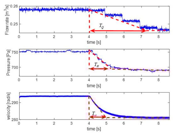Figure 8 shows the experimental transients of the flow rate, pressure, and fan’s/motor’s velocity as deviations from their steady-state values at 50 Hz and 7 cm gate position. The transients are caused by a 2 Hz step decrease of the frequency. Due to the small value of the change, the initial step response behaviour is similar to step responses of aperiodic transfer functions. It can be seen that the flow rate time constant is bigger than the velocity time constant and that the pressure time constant is close (just slightly more) to . This observation justifies the use of differential Equation (1) in the centrifugal fan modelling and confirms that the pressure changes almost synchronously with the change of the shaft velocity (no extra differential equation is required). A2108 Optical Tachoprobe is used as a velocity sensor. To exclude the influence of the place of the flow rate sensor turbine installation within the duct, the following simple computations are done. The cross-section of the duct is 0.0146 m2. The air velocity in the duct is 0.258/0.0146 = 17.67 m/s. The distance of the turbine position from the fan output is 0.78 m. Then, the time for the air from the fan to reach the turbine is 0.0441 s, and this is significantly smaller than . Therefore, the contribution of the place of the turbine installation into can be neglected.