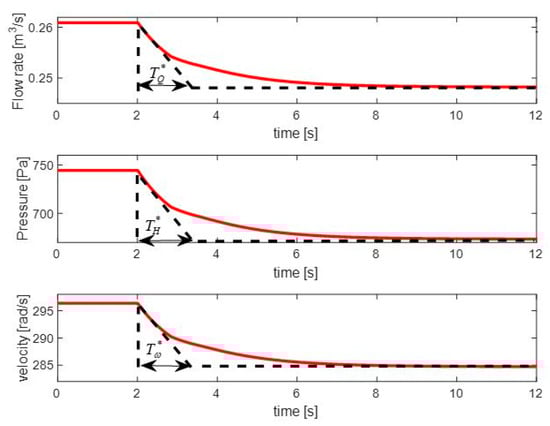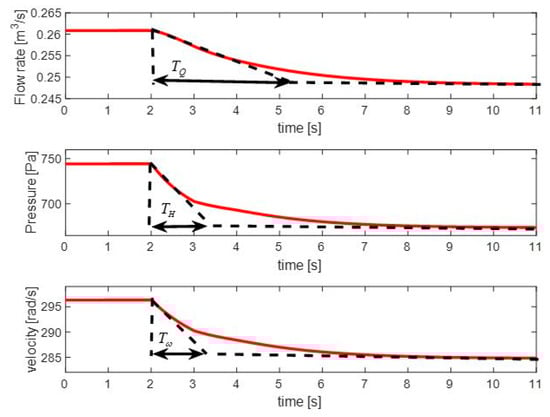 Figure 9 demonstrates the results of the model simulation, with the increased integration constant = 5000 Pa∙s/(m3/s), to be close to the experimental data in Figure 8. This shows that the added first-order flow rate differential equation is sufficient for good matching with the experimental transients. The maximum simulation dynamical errors for the flow rate, pressure, and velocity are 1.2%, 2.2%, and 2.5%, respectively, compared to the corresponding experimental transients in Figure 8. If the value of decreases to 0.1 Pa∙s/(m3/s), the model becomes closer to the quasi-steady one. For this case, all three time constants were obtained close to each other (see Figure 10), which contradicts the experiments. Therefore, the determination of the for specific operating points (narrow control ranges) should be done based on the step responses and not based on the starting-from-zero test.