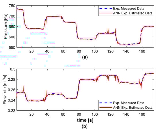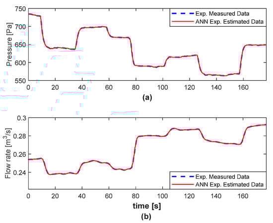 The dynamical ANN estimators are trained based on the experimental transients in Figure 11 as well. Figure 13 shows their estimation during the recorded experimental transients used for training. The quality of the dynamical estimation is better than for the quasi-steady estimators. The estimation for experimental transients not used in training is also in good agreement with the test data [23]. This means that the introduced first-order estimators’ dynamics correctly reflect the dynamical centrifugal fan/pump modelling.