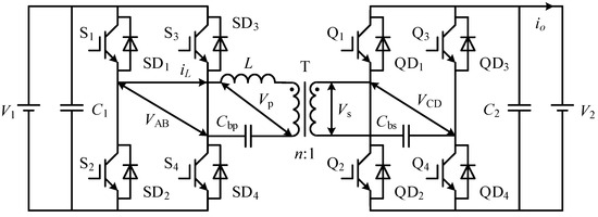 The topology of a DAB converter with DC blocking capacitors is shown in Figure 1. V1 and V2 are input and output DC-link voltage, respectively. The turn ratio of the transformer is n. VAB is the primary side bridge output voltage, and VCD is the secondary side bridge output voltage. Vp is the primary side voltage of the transformer, and Vs is the secondary side voltage of the transformer. Cbp is the DC blocking capacitor of the primary side, and Cbs is the DC blocking capacitor of the secondary side. L is the sum of external series inductance and transformer leakage inductance. iL is the inductor current. io is the output current. C1 and C2 are the DC bus capacitors for input and output. With the aid of DC blocking capacitors, ADM can adjust the DC bias of DC blocking capacitors to control the output voltage.