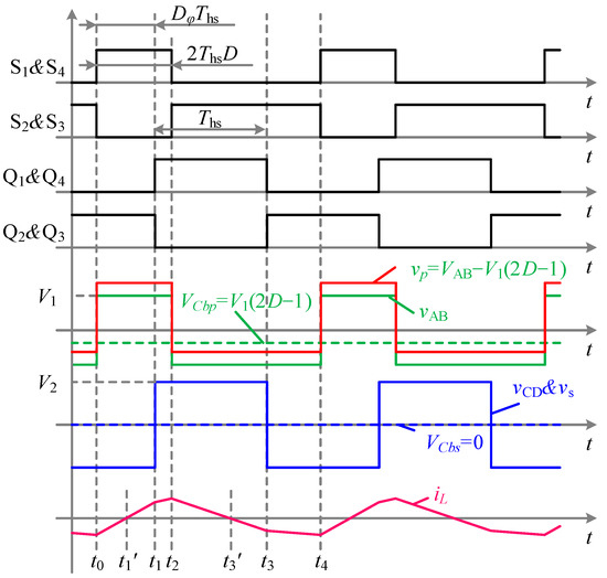 The typical ADM waveforms based on DC blocking capacitors are shown in Figure 2. Ths represents half of a switching cycle. Vcbp and Vcbs represent DC bias voltage on the primary and secondary side DC blocking capacitors, respectively. D is the duty cycle of primary bridge output in one switching cycle. The phase shift angle φ, which is calculated in radians as the difference between the rising edges of the primary and secondary side voltages of the transformer, varies between −π and π. A positive phase shift (φ > 0) is shown in Figure 2, corresponding to the phase shift ratio Dφ in half a switching period. Dφ is the ratio of the difference between the rising edges of the primary and secondary side voltages of the transformer to half a switching period.