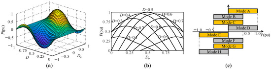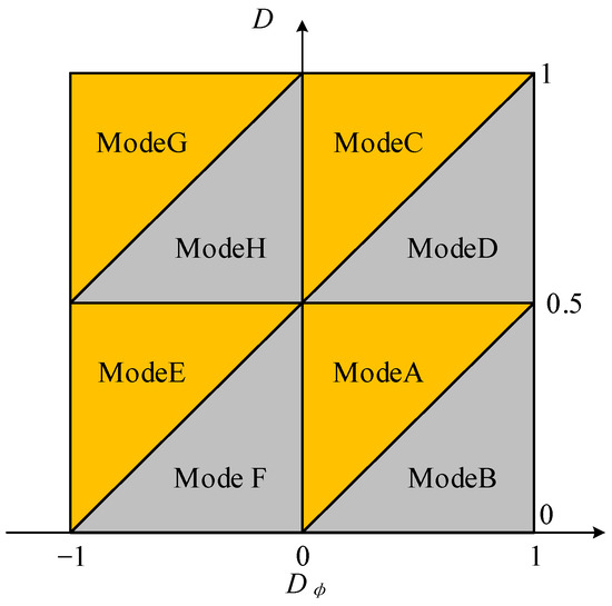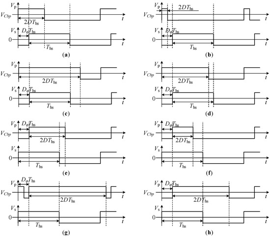 Firstly, when Dφ ≥ 0 and D ≤ 1/2, the rising edge of Vp is ahead of Vs. In this case, when D > Dφ/2, the operation state is mode A, and when D ≤ Dφ/2, the operation state is mode B. Secondly, when Dφ ≥ 0 and D ≥ 1/2, the rising edge of Vp is ahead of Vs. Therefore, when D > Dφ/2 + 1/2, the operation state is mode C, and when D ≤ Dφ/2 + 1/2, the operation state is mode D. Thirdly, when Dφ ≤ 0 and D ≤ 1/2, the rising edge of Vs is ahead of Vp. In this situation, when D > Dφ/2 + 1/2, the operation state is mode E, and when D ≤ Dφ/2 + 1/2, the operation state is mode F. Lastly, when Dφ ≤ 0 and D ≥ 1/2, the rising edge of Vs is ahead of Vp. Thus, when D > Dφ/2 + 1, the operation state is mode G, and when D ≤ Dφ/2 + 1, the operation state is mode H. The waveforms of Vp and Vs in different modes are shown in Figure 3, and the ranges of corresponding variables are presented in Table 1.