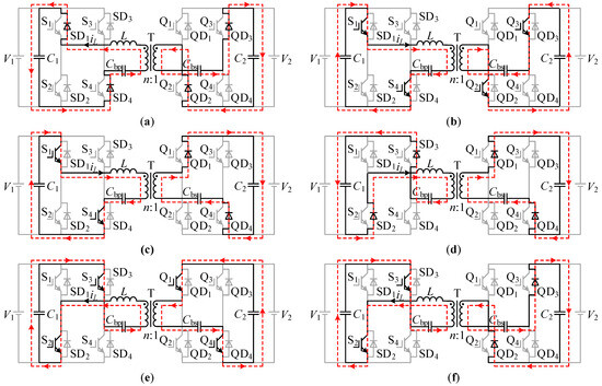 The equivalent circuit of each stage in mode A from t0 to t4 can be drawn according to Figure 2, and the results are shown in Figure 5. The red lines in Figure 5 indicate the current flow of each stage in mode A.