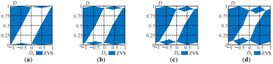 The same method can be used to solve the other seven modes. Thus, the range of ZVS in the full operating area is shown in Figure 7. Figure 7 shows the range of ZVS in the full operating area when m = 0.1, m = 0.1, m = 0.3, and m = 0.4, respectively.