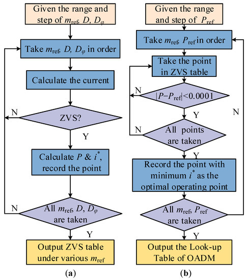 Flow chart of the off-line table-building procedure: (a) flow chart of the ZVS table; (b) flow chart of the optimal table.