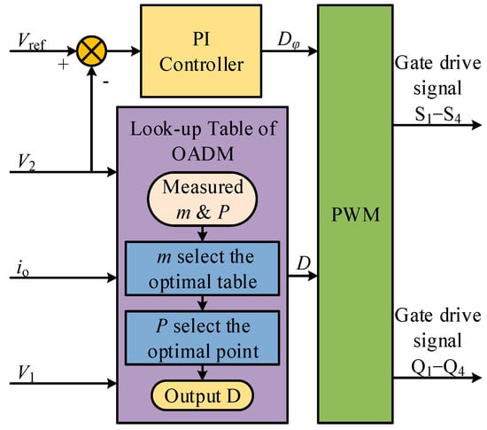 The overall control scheme contains an outer control loop for output voltage and an inner control loop for efficiency optimization. The outer loop is mainly composed of a PI controller. Firstly, the measured output voltage V2 is compared to the set point value Vref and fed into a PI controller to determine the required Dφ. The inner loop is mainly made up of a lookup table for OADM. The lookup table is of utmost importance for efficiency improvement. It directly decides the output value of D and requires actual values of P and m to be calculated through sampling. By combining the actual sampling values with Formula (11), the actual P can be obtained as Formula (19). The measured DC bus voltages V1 and V2, and the output current io are fed into the lookup table controller to calculate the actual value of P, m. The value of D is determined by comparing the actual value of P, m with the value in the lookup table. The actual value of m will select an optimal table with various values of P. The actual value of P will select the optimal point and output the value of D. The output value of D from the table can limit the current stress of the converter. For robustness, Dφ cannot be directly assigned to the value of the optimal point in the inner control loop from the lookup table but needs to be adjusted by a PI controller. This ensures the reliability of the system during dynamic transitions to a certain extent. With D and Dφ the PWM signal can be generated.