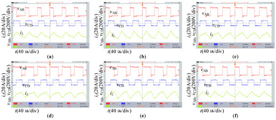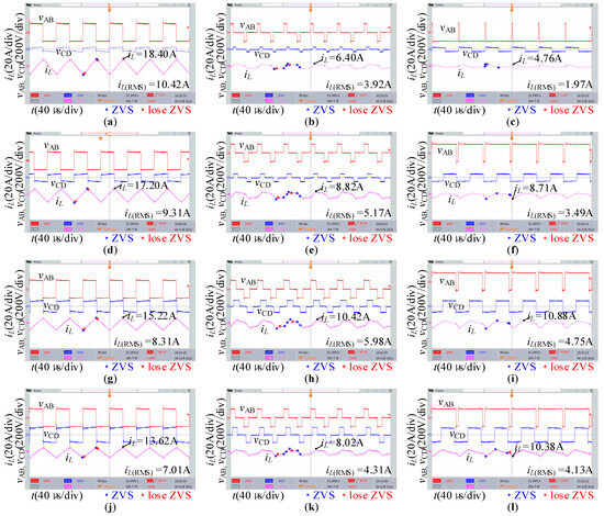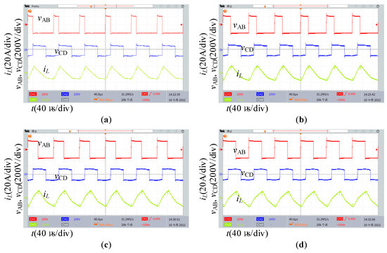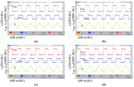 Figure 15 shows the experimental waveform under the ADM when P = 0.76, V2 = 120 V, and m = 0.3. As shown in Figure 15, different combinations of D and Dφ can transmit the same power, thereby confirming the feasibility of optimization.