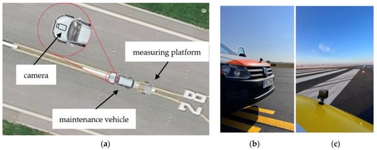 Measuring platform for quality testing of airport lamps (a), camera mounted on the airport maintenance vehicle (b), camera on the airport maintenance vehicle located on the runway (c).