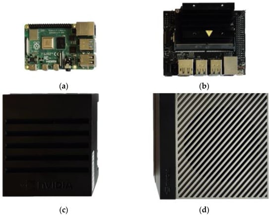Embedded devices used during experimental tests: (a) Raspberry Pi 4B, (b) NVIDIA Jetson Nano, (c) NVIDIA Jetson Xavier AGX, and (d) NVIDIA Jetson Orin AGX.