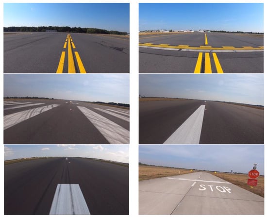 Figure 4 shows sample frames with the road markings used on airport areas in the form of the central axis of the runway (white dashed lines), as well as exit tracks and central axes of taxiways (solid yellow lines). It should be noted that the airport lamps are not mounted in the axis of the center lines, but with a certain shift; therefore, it is so important to correctly detect the edges of the airport markings in order to determine the relative position of the next luminaire and to correct the approach trajectory.