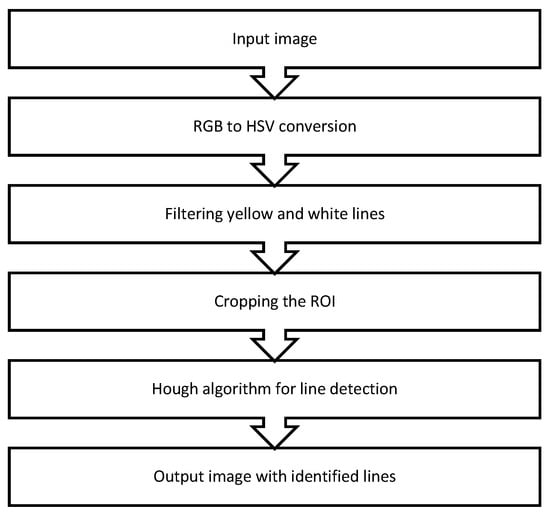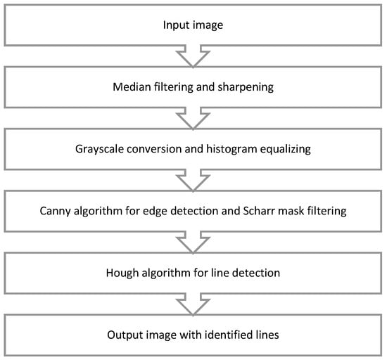 This algorithm (Figure 5) was implemented in Python 3.7.6 using the OpenCV library (version 4.2.0). The main innovation involves isolating color shades of lines (white or yellow) from the runway’s grey or dark grey background. The algorithm consists of several stages:
