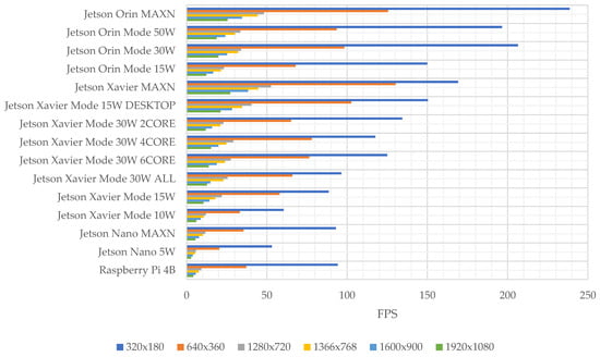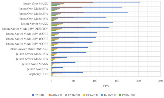 A benchmark analysis of NVIDIA Jetson Platforms (Nano, TX2, NX, and AGX) are shown in the paper []. Measurements of resource usage and power consumption are presented without the influence of image resolution. Performances of single-board computers in NVIDIA Jetson Nano, NVIDIA Jetson TX2, and Raspberry PI4 through the Convolutional Neural Network (CNN) algorithm created by using a fashion product images dataset are compared in []. The authors of this paper analyzed performance defined as the processing power (Central Processing Unit—CPU, Graphics Processing Unit—GPU), memory (Random-Access Memory—RAM, cache), power consumption, and cost. Unfortunately, no analysis of frame rate speed processing (Frames Per Second—FPS) was conducted.