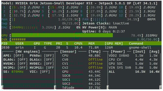 Energy consumption was measured using the Jetson-Stats software []. It is an advanced system monitoring and control package explicitly designed for the NVIDIA Jetson series, including the Orin, Xavier, Nano, and TX models. The tool (Figure 9) is a vital resource for researchers and developers seeking in-depth analysis and performance tracking of their NVIDIA Jetson boards. Key features of Jetson-Stats include: