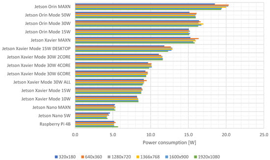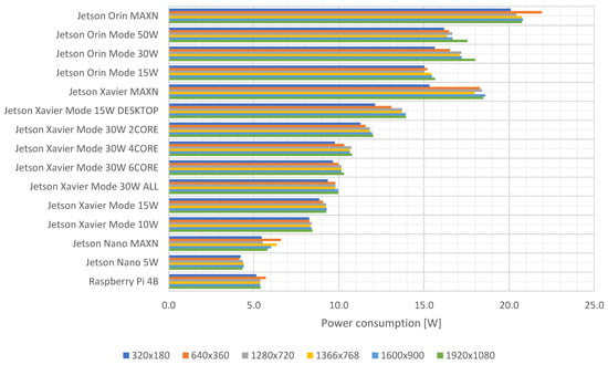 More advanced modules, e.g., NVIDIA Jetson Orin AGX working in MAXN mode and NVIDIA Jetson Xavier AGX in MAXN mode, have higher power requirements, which is quite an obvious observation, because at the same time, the FPS obtained for these devices is definitely higher, as shown in Section 4.1. For individual power modes, there is a slight variation in power consumption at different resolutions, and the measured values are quite similar. This is because there are no limits to the FPS values, which were individually maximum for each of the experiments. To better assess the power requirements, which depend on both the type of algorithm, the resolution used, and the FPS value obtained, these dependencies have been taken into account and summarized in the next sub-chapter.