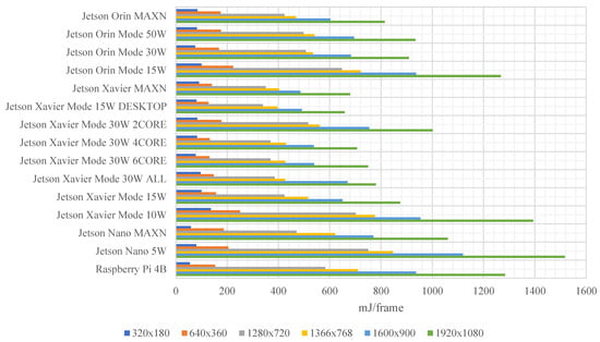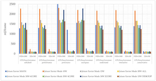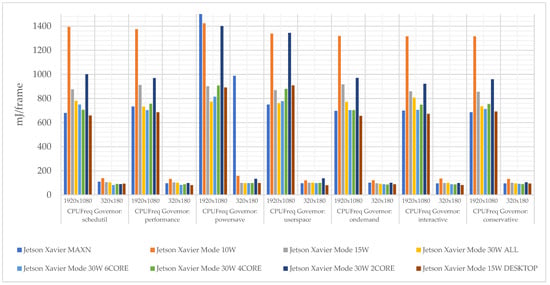 The experiments carried out, as part of the assumptions and algorithms used, show that the best operating modes that meet the assumptions are powermode MAXN and DVFS policy schedutil (680 mJ/frame); however, in most cases, the differences are in the range of 7%: