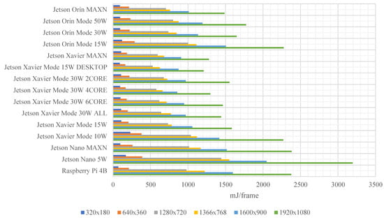The simplest Raspberry Pi 4B modules are suitable for solutions where resolution requirements are not too high. As a series of experiments has shown, standard values at the 30 FPS level are processed with the use of such modules at a maximum resolution of 640 × 360. For such resolutions, the advantage of using Raspberry Pi 4B modules is the low cost of the device and relatively low energy demand to process one frame of the video sequence. This device can work with passive cooling, and it is not necessary to use an additional fan, which required an additional 0.5 W during the tests. An alternative solution to using the Raspberry Pi 4B is to use the NVIDIA Jetson Nano module. This device has two operating modes: 5 W and MAXN. In MAXN mode, it has performance and energy requirements similar to those of Raspberry Pi 4B.