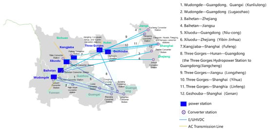 The Three Gorges large hydropower system (TGLHS) is mainly composed of four giant hydropower stations in the lower reaches of the Jinsha River and two giant hydropower stations in the middle and lower reaches of the Yangtze River [5,6], as shown in Figure 1. The total installed capacity of the six cascade hydropower stations is 70.315 million kW, accounting for about 17% of the national hydropower installed capacity. In 2022, the total power generation was about 262.2 billion kW, accounting for nearly 20% of the national hydropower generation. Both in terms of installed capacity and power generation, it ranks first in the country’s hydropower industry and plays a very important role in China’s hydropower and national energy structure system.