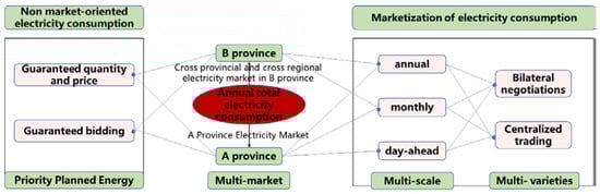 The participation of hydropower in the electricity market involves the combination and allocation of hydropower and electricity cakes in three dimensions: the time scale market (annual, monthly, daily, intraday, and real-time), the diversified spatial market (intra-provincial, inter-provincial, and interconnection line regional markets), and trading varieties (bilateral, listing, daily market, and peak shaving and frequency regulation auxiliary services) [16,17]. The essence is a multidimensional long-, medium-, and short-term nested combination optimization problem. This is the basic work for the participation of the Three Gorges hydropower system in the electricity market. According to the different stages in the promotion of the electricity market, there are two stages involved: the transitional electricity market and the complete electricity market, as shown in Figure 2. Therefore, in response to the two stage issues mentioned above, it involves two core issues: how to negotiate with the receiving power grid to determine the priority electricity quantity and price, and how to participate in the power trading of the receiving power grid.
