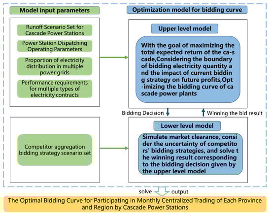 Considering the requirements of annual electricity contract performance, constraints on the consumption space of the end grid market, constraints on the inter-provincial transmission capacity of the downstream cascade hydropower plants of the Jinsha River, and requirements for the proportion of electricity distribution among multiple provinces, as well as stochastic electricity prices and runoff processes, a double-layer stochastic programming model is constructed to synergistically optimize the segmented bidding curves of each power station downstream of the Jinsha River participating in the monthly centralized market of each province. Firstly, the uncertainty of incoming water is represented in the model through scenario analysis [26]. Secondly, the bidding strategies of competitors are aggregated to suppress the uncertainty of individual bidding strategies. Then, the aggregated bidding strategies of competitors are inferred through the historical market-clearing electricity prices and transaction electricity quantities, generating a set of competitor strategy scenarios to describe the uncertainty of the Jinsha River cascade’s monthly centralized market competitor strategies in each province. Thirdly, considering that the majority of electricity in the Jinsha River cascade will still be consumed in the form of planned electricity or annual bilateral electricity within a certain period of time, the electricity share participating in the monthly centralized market of each province and region is relatively small, and there is a lack of historical transaction data, making it difficult to accurately estimate the market supply and demand curve. Therefore, it is assumed that the Jinsha River cascade hydropower system will participate in the monthly centralized trading of each province and region as a price receiver. In this case, its bidding strategy will not affect the aggregation strategy of its competitors. Fourthly, the model takes months as the optimization step and years as the optimization cycle, so as to fully consider the impact of the current bidding strategy on the future power generation capacity when optimizing and formulating the monthly bidding strategy for the Jinsha River cascade hydropower system [27].