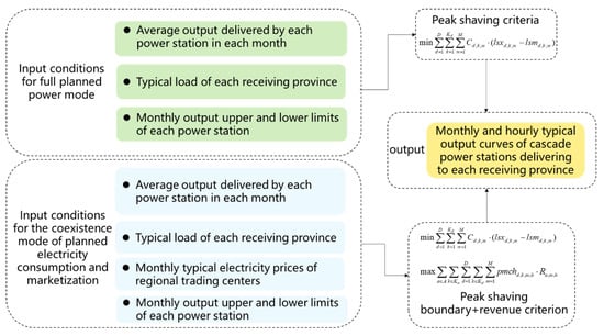The focus of this problem lies in the curve decomposition and verification analysis of the trading electricity quantity for cascade hydropower dispatching. It can be divided into annual, monthly, and daily tasks based on time scales. The planned electricity penalty mechanism for various scale tasks is based on the transaction rules issued by the state. The negative deviation of planned electricity is assessed based on several times the planned electricity price, and the positive deviation is settled in time based on market-oriented electricity prices. The annual curve decomposition task is to determine the boundary of planned electricity levels around October each year. At this stage, it is necessary to determine how the planned electricity is accurately distributed between power stations each month, and to construct decomposition criteria for the typical curves of each month based on each receiving province [28]. According to certain criteria, the typical output curves of each power station and each province are determined. After marketization is liberalized, it is also necessary to combine market punishment mechanisms and market conditions in different provinces to carry out the marketization of electricity levels in each month among provinces. The monthly curve decomposition task takes the annual curve decomposition results in that month as the performance boundary. Before or after the 10th day of each month, it is necessary to determine the planned electricity consumption decomposition curves for each power station, province, and variety in the following month based on the performance situation of the month that has occurred and the latest predicted inflow, combined with the time sharing coefficient limit issued by the power grid. After the liberalization of marketization, it is also necessary to adjust the market-oriented electricity consumption of each power station, province, and variety according to the market conditions of different provinces to provide a reasonable distribution among provinces.