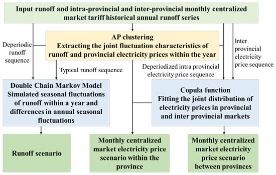 We plan to use the market electricity price runoff joint scenario generation method to reasonably describe the complex correlation stochastic process of electricity prices in different markets at the regional and provincial levels, as well as the monthly runoff of hydropower stations. As shown in Figure 8. This method mainly consists of three core steps: using nearest neighbor propagation (AP) clustering to extract the annual periodic joint fluctuation characteristics of runoff and the provincial electricity prices; using a double chain Markov model to describe the seasonal fluctuations of runoff within a year and the differences in annual abundance, evenness, and dryness; and extracting the correlation between provincial and regional electricity prices through the Copula model. The main process of this method is shown in the following figure, where the de-periodic runoff series, typical runoff series, and de-periodic provincial electricity price series respectively represent the annual differences in runoff, the seasonal changes in runoff, and the impact of removing runoff on electricity price correlation [29,30,31].