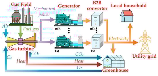 To overcome the problems resulting from the delivery of natural gas, a realistic solution is directly applying gas to produce electricity near gas fields and constructing on-site greenhouses, forming cogeneration facilities, as shown in Figure 1. In such a system, the extracted gas is combusted to drive the turbine, which serves as the mechanical input for the generators. Furthermore, the produced electricity is primarily exported to the public grid while a portion of the power can be allocated for greenhouses functioning and local households. Additionally, byproducts from the generation, carbon dioxide (CO2) and exhaust heat, respectively, can also fertilize plants and maintain the temperature of greenhouses. This innovation remarkably diminishes the environmental impacts related to gas utilization and opens the electricity market to gas producers.
