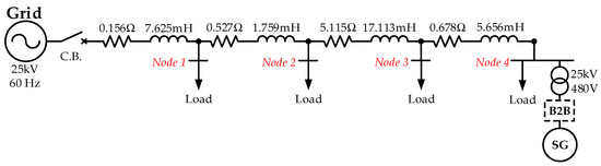 In this section, the structure and performance of an existing cogeneration power plant located at Gull Lake, Alberta are elaborated. As in the lumped model shown in Figure 2, the main feeder includes four nodes, and the electricity is provided by a 480 V/2.5 MVA gas turbine SG at Node 4. At the output terminal of the SG, a transformer is equipped to step up the output voltage from 480 V to 25 kV, and the dashed box indicates the proposed location for installing the B2B converter. It is worth noting, however, that the measurements of power quality presented below are undertaken without the integration of the B2B converter.