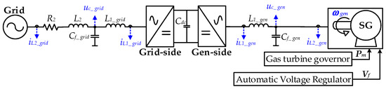 The structure of the gas generation is shown in Figure 3. In this system, the SG is interconnected to the grid through the B2B converter, where the line impedance is R2 and L2. A B2B converter comprises two VSCs connected in series through a DC link capacitor, Cdc. These VSCs are differentiated by their locations, with one being referred to as the grid-side VSC and the other as the generator-side VSC. To distinguish which side of VSC the variables belong to, subscripts ‘grid’ and ‘gen’ are used. On each side of the VSC, a typical three-level DC/AC converter is applied, with an LC filter (L1 and Cf) coupled at its output terminals. The filter inductor current is symbolized as iL1, and uc and iL2 denote the VSCs’ output voltage and current, respectively. For the SG operation, the mechanical input (Pm) is provided by the gas turbine, and the generator rotation speed (wgen) is regulated by the frequency droop or isochronous control adopted in the speed governor (GOV). Concurrently, the automatic voltage regulator (AVR) monitors the terminal voltage of the generator and adjusts the excitation system to produce appropriate field voltage (Vf), ensuring the SG maintains a stable output voltage. In this study, the IEEE ST1A model is utilized as the excitation system to regulate the SG’s field current [34].