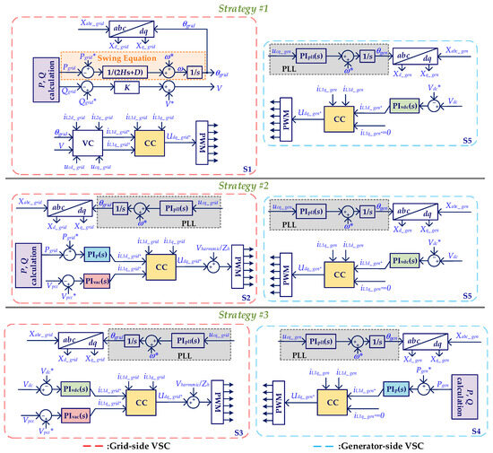 Figure 4 shows the control diagrams for both sides of VSCs, where ‘*’ indicates the reference values; variable ‘X’ represents the inductor current (iL1), output current (iL2), or output voltage (uc), and ‘VC’ or ‘CC’ stands for voltage or current control loop. Similar to Figure 3, subscripts ‘grid’ and ‘gen’ are used to identify if variables belong to either grid side or generator side, and the subscripts d and q denote the variable in respective axes. S1 shows the scheme of the GFM control, where the output active power (Pgrid) and reactive power (Qgrid) of the converter are used to generate the phase angle (θgrid) and voltage magnitude (V) of the voltage reference. Further, the orange highlighted portion expresses the swing equation used for the grid synchronization. Then, the voltage control loop (VC) employs the proportional-integral (PI) and feed-forward control to set the current reference. The inner current control loop (CC) precisely regulates the grid current based on the obtained reference, and the output of the CC is used to modulate the switching signals of the converter. Contrarily, S2-S5 belongs to GFL controls, where synchronization with the grid is achieved via the PLL. The principle of the PLL is illustrated within the gray highlighted area, where the outer loops employ the PI controllers to generate the reference of the dq-axis current. By regulating real power or DC voltage, the d-axis current reference (iL1d*) is determined. Additionally, the q-axis current reference (iL1q*) of the grid-side VSC is set by AC voltage control, while the generator-side VSC keeps it at zero. Then, these current references serve as the setpoints for grid current regulation within the CC. All hardware and controller parameters are given in Appendix A.