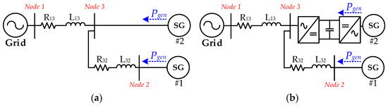 Structure diagram of multi-generator system. (a) Both SGs are directly connected to the utility grid; (b) one of the SGs is connected to the utility grid through the B2B converter.