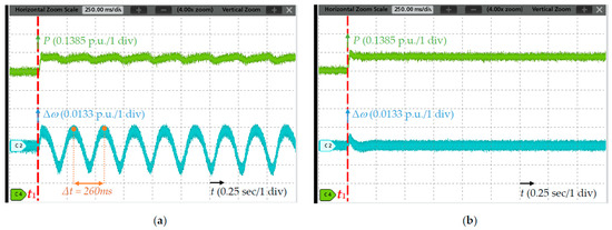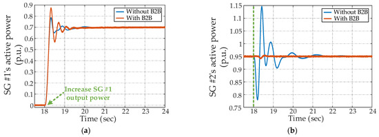 Meanwhile, real-time simulations are carried out for both system configurations, and the results are shown in Figure 8. During the simulations, a step change is applied in the output power of SG #1 at 18s, while the dynamic response of SG #2 is observed. The obtained results elaborate that, in the absence of the B2B converter, modifying the output power of SG #1 leads to the power oscillation of SG #2, resulting in an instantaneous output exceeding its rated capacity by approximately 15%. With the introduction of the B2B converter, however, the output power of SG #2 can remain within the power rating, and the dynamics of a multi-generator system can be ameliorated through damping the LFO. These findings not only validate the above theoretical analysis but also emphasize the effectiveness of the B2B converter in enhancing system dynamics.