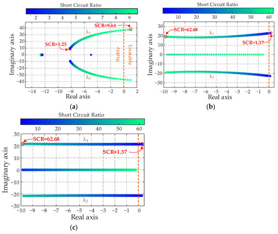 Root-loci plots under varying SCRs. (a) Strategy #1; (b) strategy #2; (c) strategy #3.